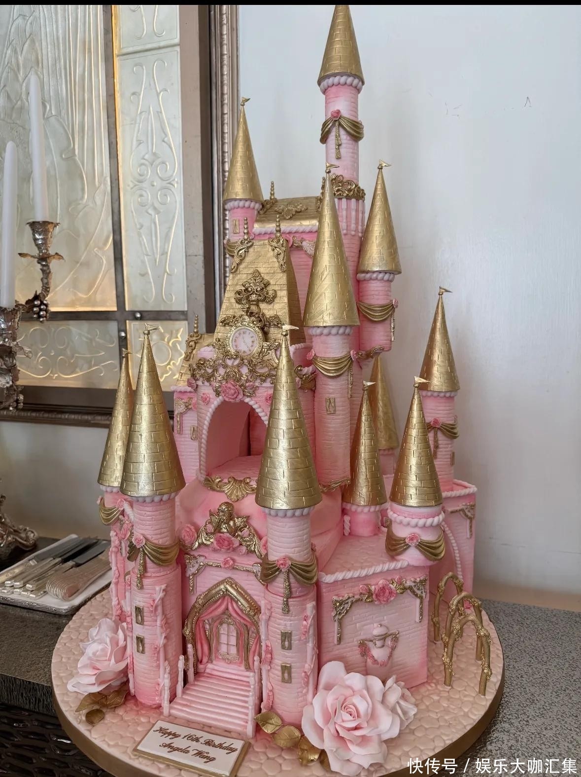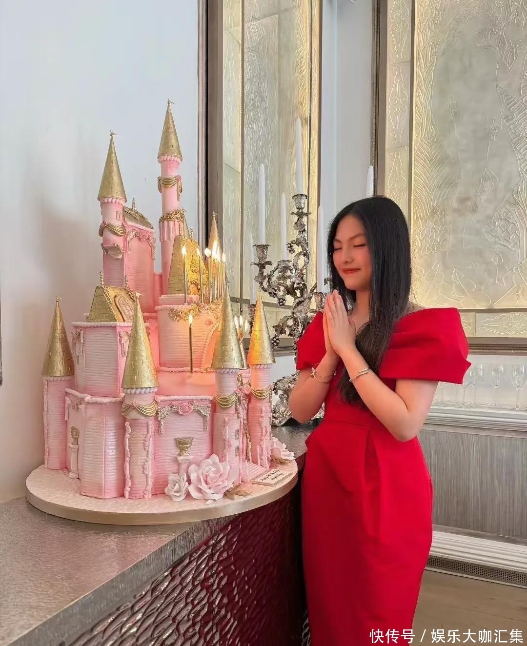 最引人注目的莫过于那座巨型粉色城堡蛋糕,外形酷似迪士尼乐园中的梦幻城堡,不仅造型高度还原,体积更是惊人,接近半人高。王诗龄站在蛋糕前闭眼许愿的画面,宛如童话中真正的公主降临人间,画面唯美动人。